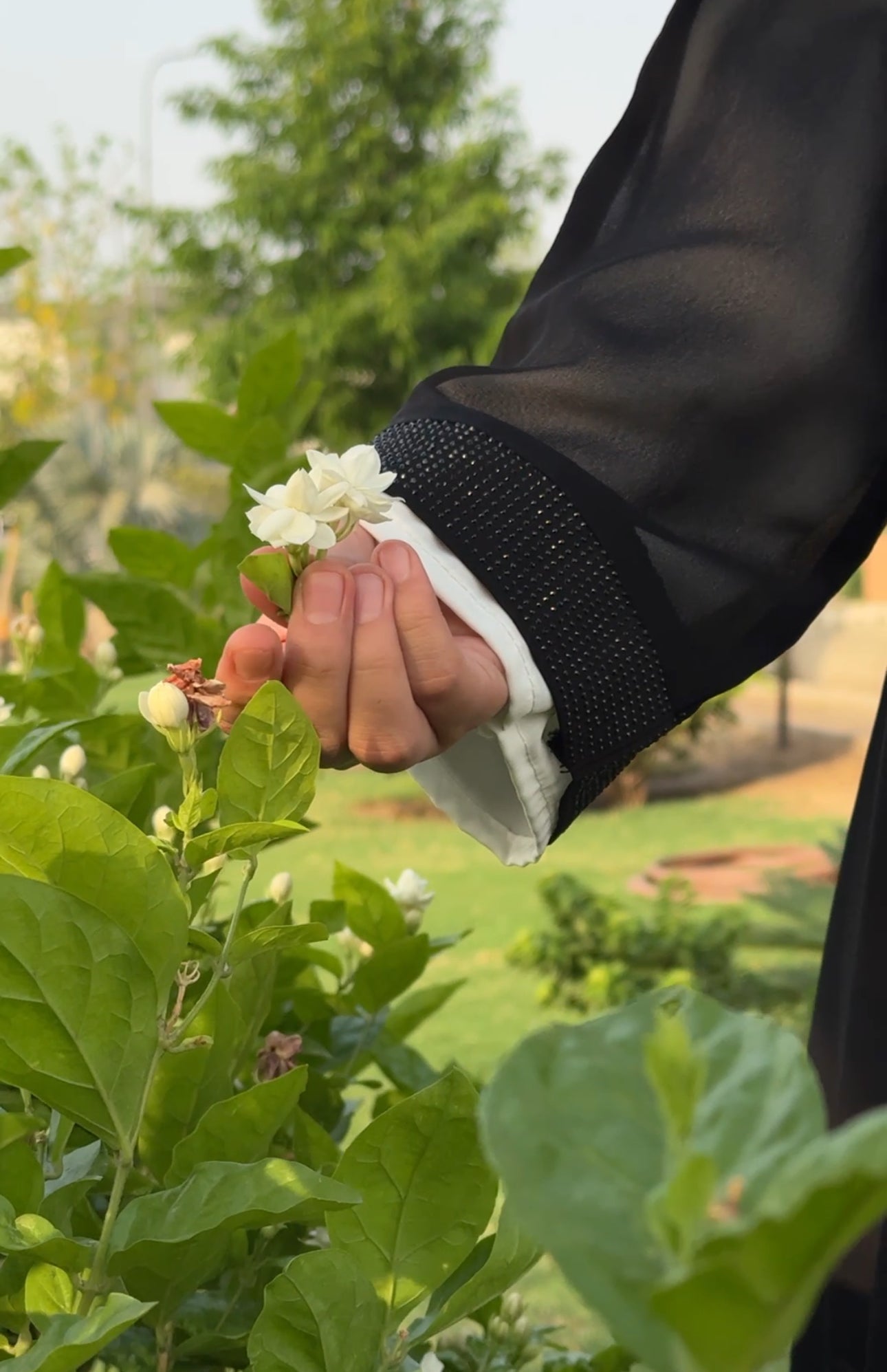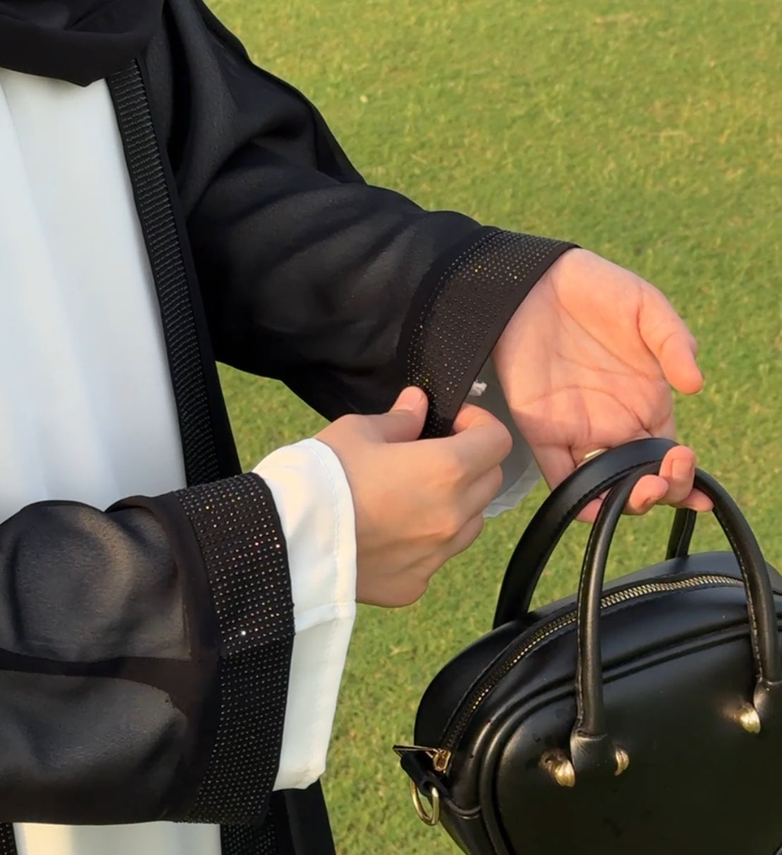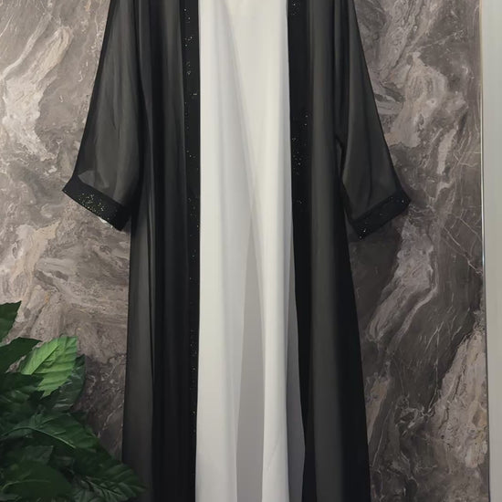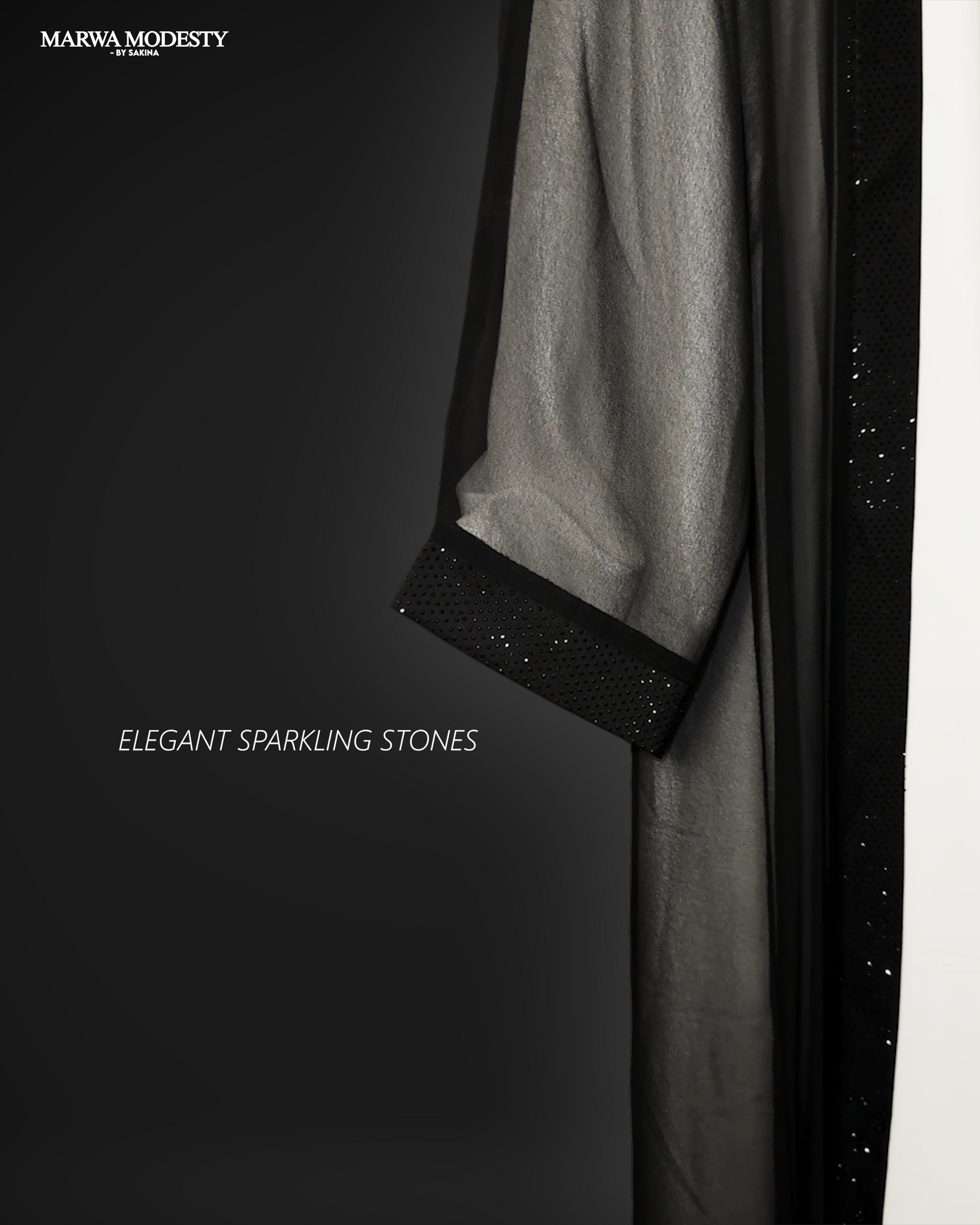 Crafted from premium Nida and Georgette Fabric, this elegant double abaya features a detachable black outer and pristine white inner. Adorned with sparkling stones and equipped with tich buttons for easy separation, it blends versatility with timeless modesty.